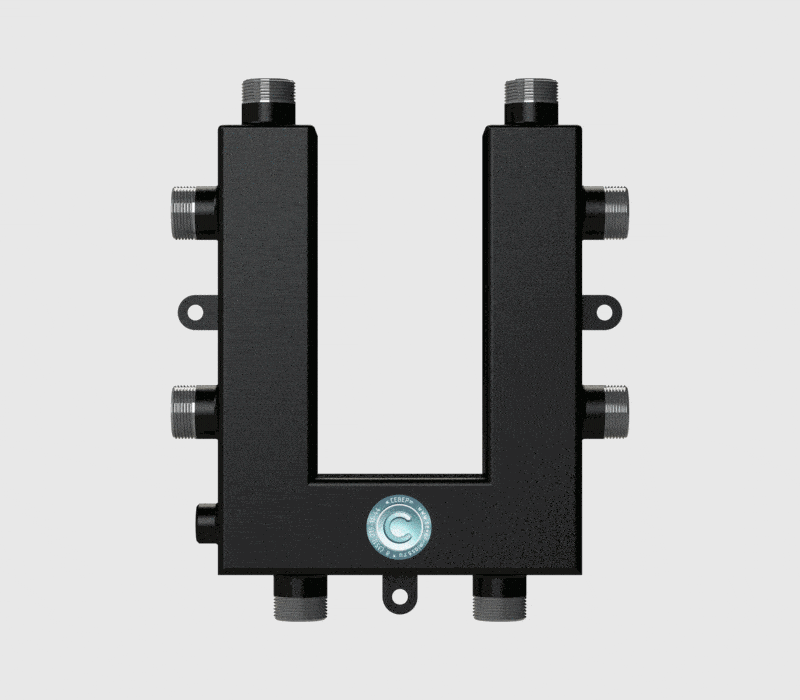 Коллектор Север V4 объединяет в себя два устройства - это гидрострелка (гидравлический разделитель) и вертикальный коллектор на 4 контура системы отопления.