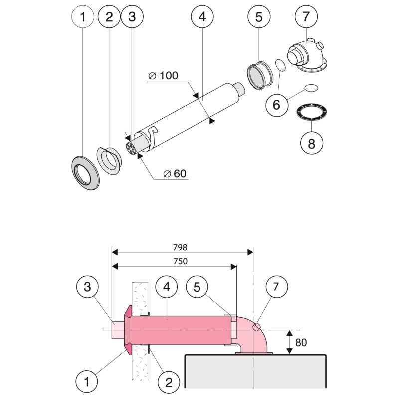 Комплект коаксиального дымохода для настенных газовых котлов. Длина трубы 750 или 1000 мм. В комплекте: